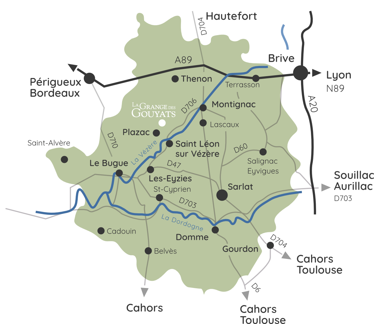 par voiture : A89 (sortie 16) - Périgueux à 33km via D6089, A20 (sortie 55) - Souillac à 50km via D62, Brive la Gaillarde à 50km via D704, Bergerac à 63km via D32, depuis Paris - sortie 17 sur A89