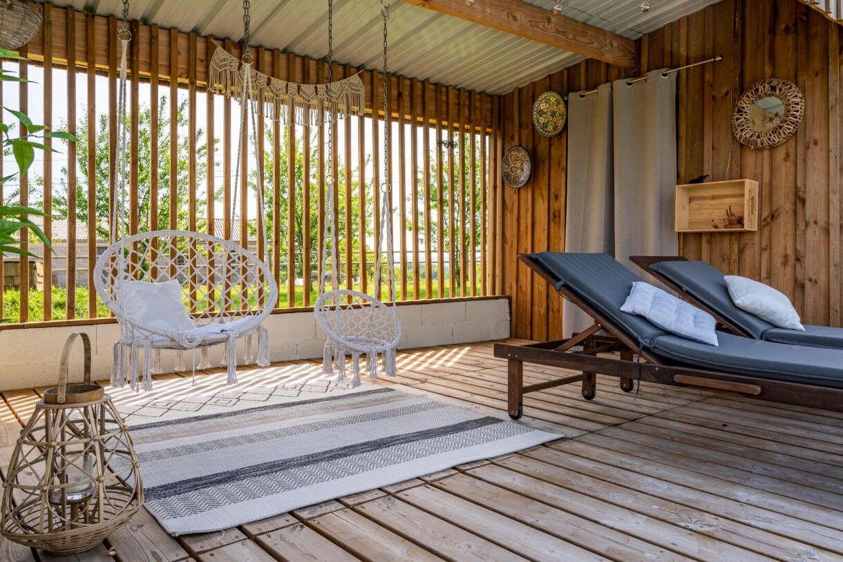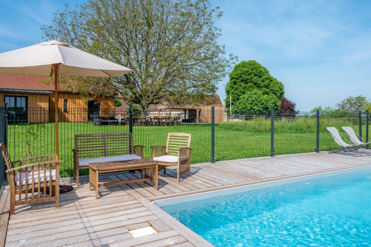 - Piscine privée securisée et clôturée, chauffée pour maintenir au moins 26 degrés (Mai à Septembre, selon météo), dimension 7×3,50m à fond plat, hauteur d'eau de 1,30m, traitée au sel, son espace détente sur terrasse en bois comporte deux chaises longues, 4 transats, deux chaises suspendues en corde, douchette solaire, parasols