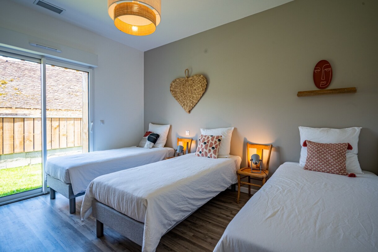- Chambre 2 : un lit de 90x200cm et deux lits de 80×200cm (pouvant être rapprochés pour constituer une configuration lit double), armoire étagère et portant