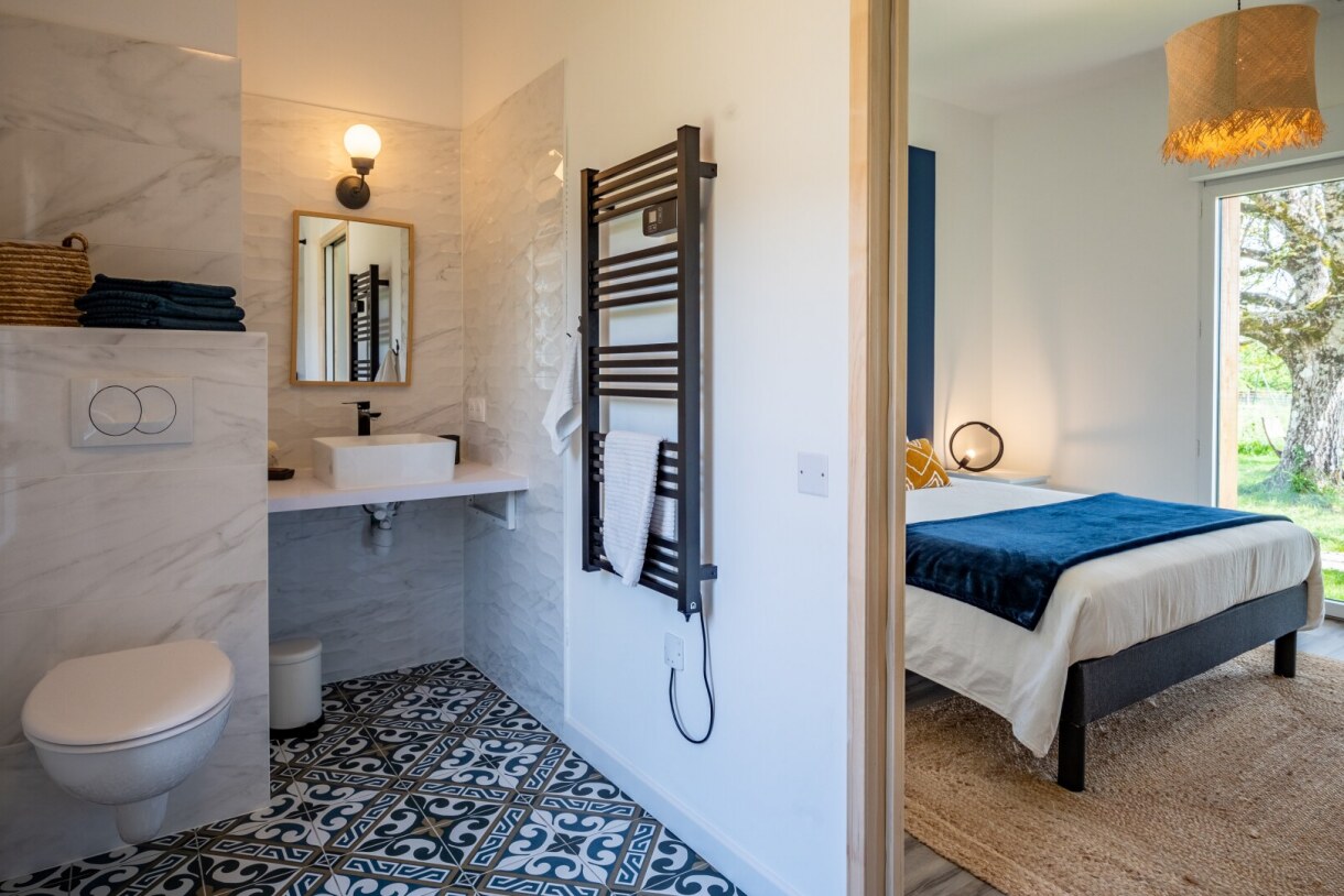 - Chambre 1 : un lit 160×200cm et sa salle d'eau attenante (douche à l'italienne, vasque, WC), étagère penderie