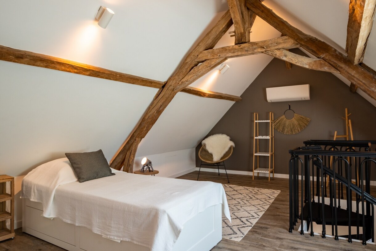 Chambre 4 avec un lit de 80×200cm, transformable en lit double 160x200cm. La mezzanine est ouverte sur le salon, accessible par un escalier en colimaçon ø130cm.